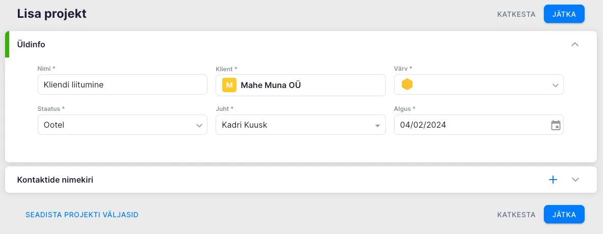 Projekti lisamisel on kohustuslikud väljad märgitud tärniga