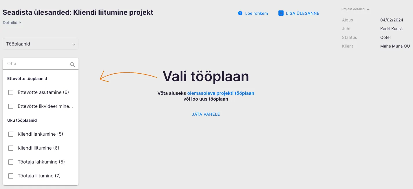 Järgmiseks vali projektile tööplaan, kas ettevõtte või Uku mallide hulgast