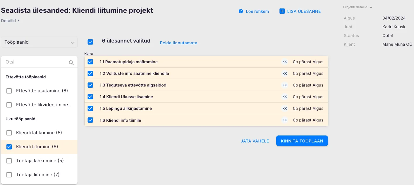 Vaata üle valitud tööplaani ülesanded. Soovi korral muuda kasutajaid või seadista ülesande ajaline sõltuvus projektist.