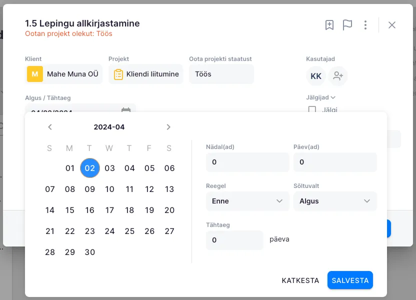 Algus/Tähtaeg - vali, millise projekti ajalise väärtusega ülesanne on seotud