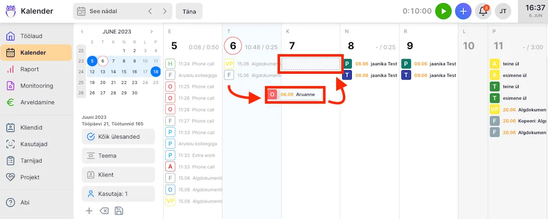 Section titled “Kalendri vaates”Vali peamenüüst “Kalender”. Kalendrivaates näed ülesandeid alustamise kuupäeva järgi. Selleks, et ülesannet edasi lükata lohista see päevale, mil ülesandega jätkata soovid. Punktiirjoonega kast näitab, kuhu ülesanne liigub.