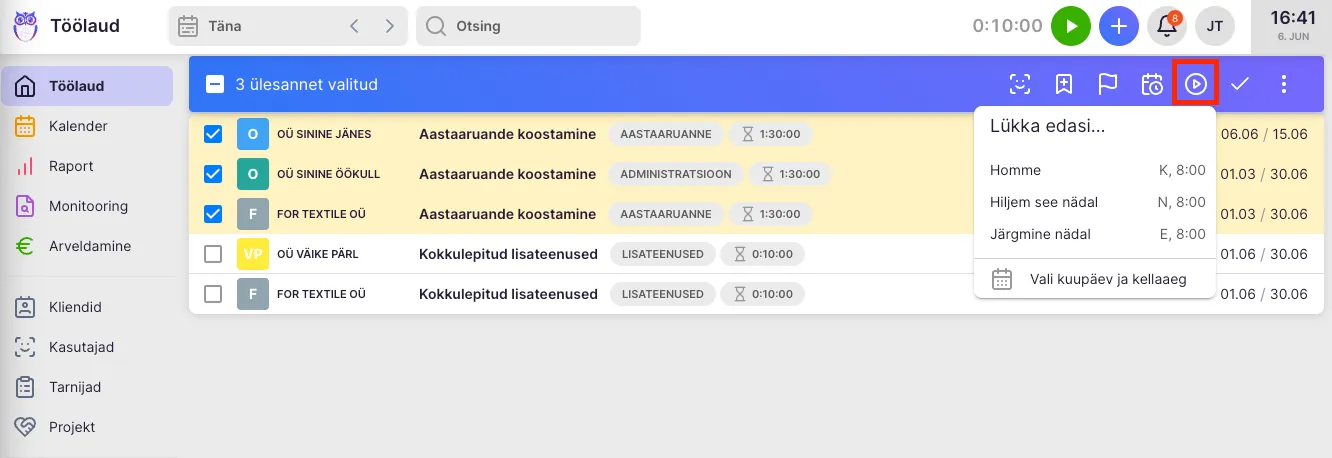 Section titled “Hulgitoiminguna”Kliki töölaual ülesannete kohal vasakus ääres kahe noolekesega ikooni. Seejärel vali ülesanded, mida soovid edasi lükata, tehes nende ette linnuke. Kui ülesanded on valitud, vajuta paremal päises olevale kalendri ikoonile. Avaneb rippmenüü, kus saad valida endale sobivaima aja. Vali sobiv kuupäev ja salvesta muudatus.