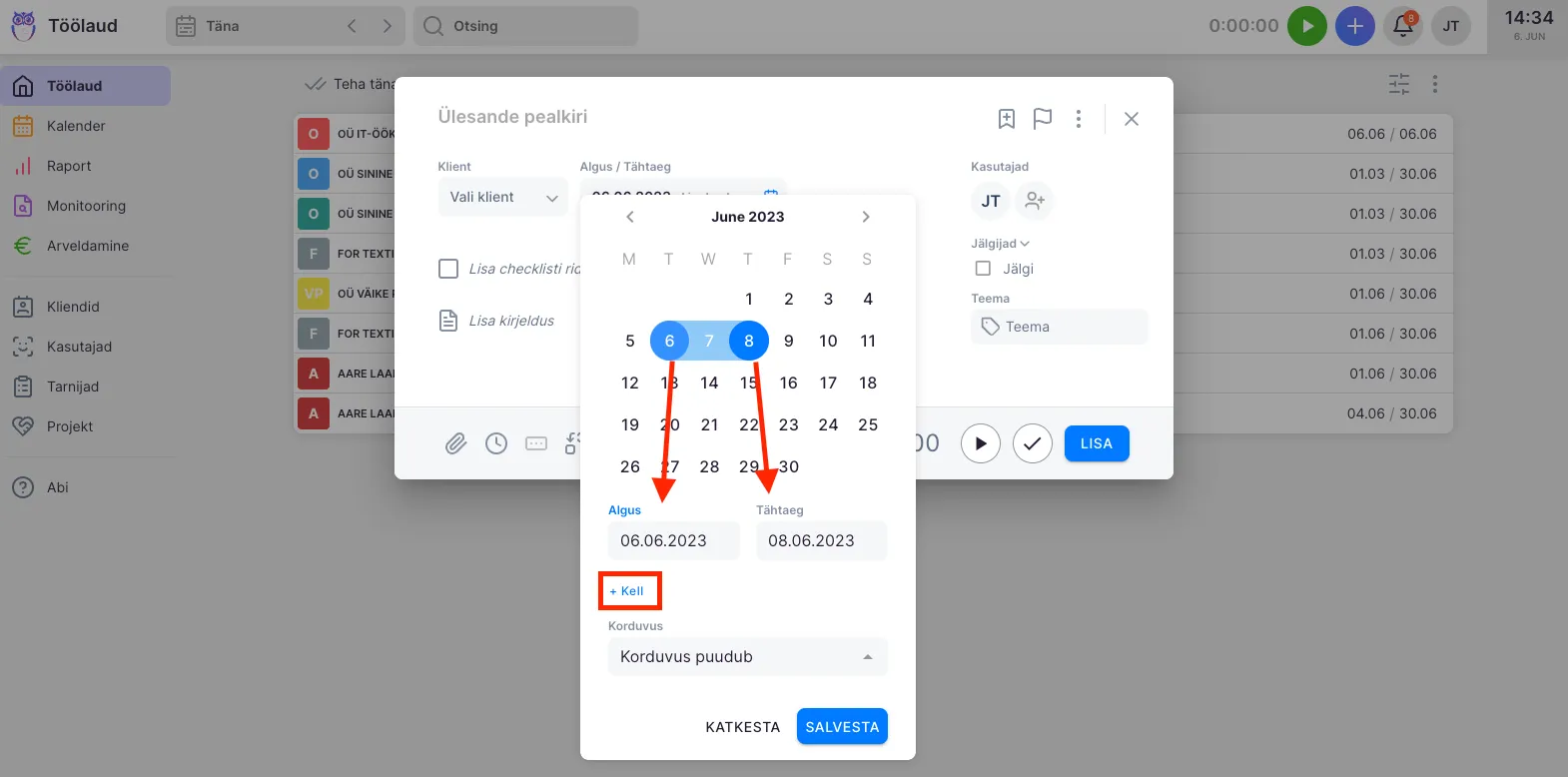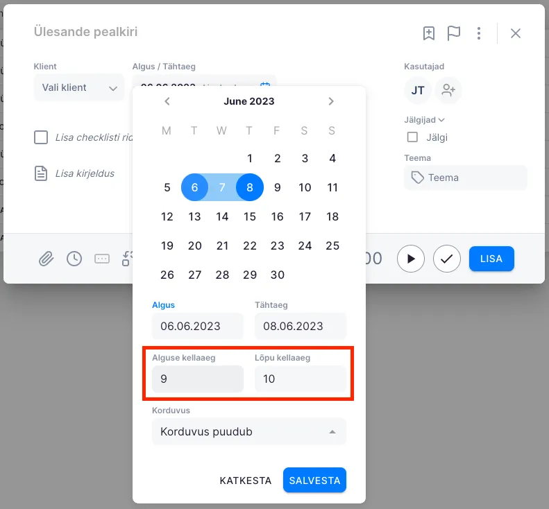 Nii algus- kui ka tähtaega saab määrata kellaajaliselt vajutades ”+ Kell” peale.