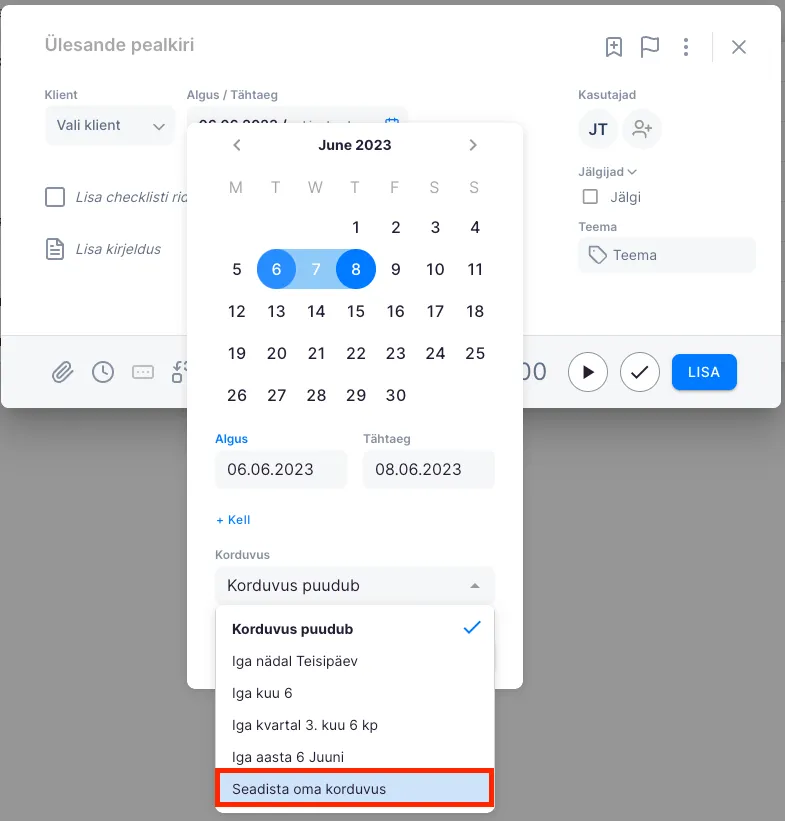 NB! Kui ülesandele on lisatud korduvus, pakutakse ka tähtaja valikuid välja vastavalt sellele, mis intervalliga korduvus valitud on. Korduvülesande lisamisel vali kõigepealt korduvus ja seejärel tähtaeg.