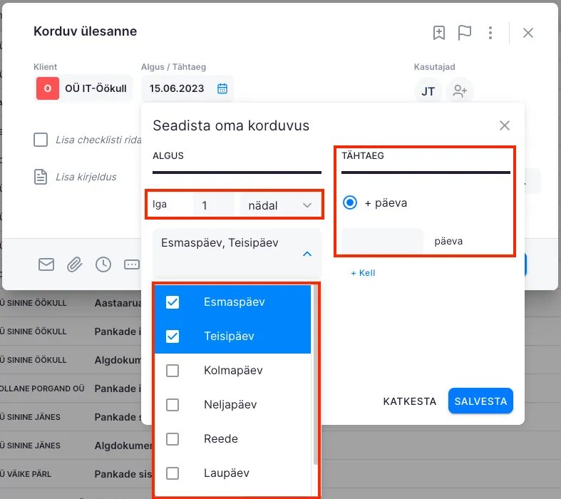 Section titled “Korduvus päevade alusel, mis on möödunud töö algusajast või kuu algusest”Vaikimisi on valitud tööpäevade lugemine alguskuupäevast. Soovi korral saab tähtaja sõltuma panna kuu algusest.