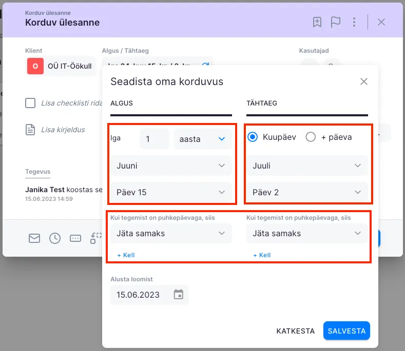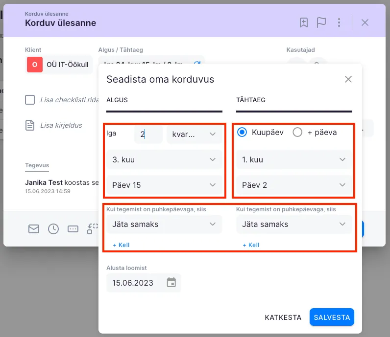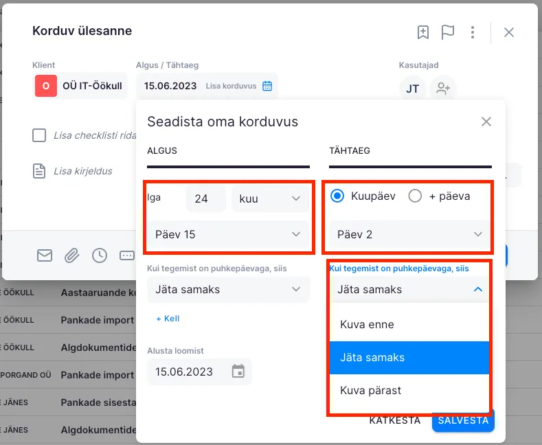 Section titled “Kuine korduvus”Kuise korduvuse puhul saad valida iga mitmes kuu ülesanne luuakse ja mis kuupäeval. Määrates tähtaega saad valida lisaks +päevade ka kuupäevaliselt, millal tähtaeg olema peab (valides väiksema kuupäeva kui alguskuupäev, lükkub tähtaeg järgmisesse kuusse). Kuna kuu päevad võivad langeda kas nädalalõppudele või riigipühadele, siis saad määrata, kas sellise juhul kuvatakse ülesanne enne, samal päeval, või pärast puhkepäeva.