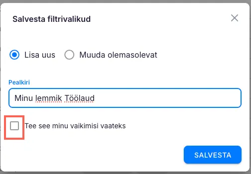 - Kui sobiv töölaud filtritega on koostatud, siis salvesta valik vajutades disketi ikoonile.