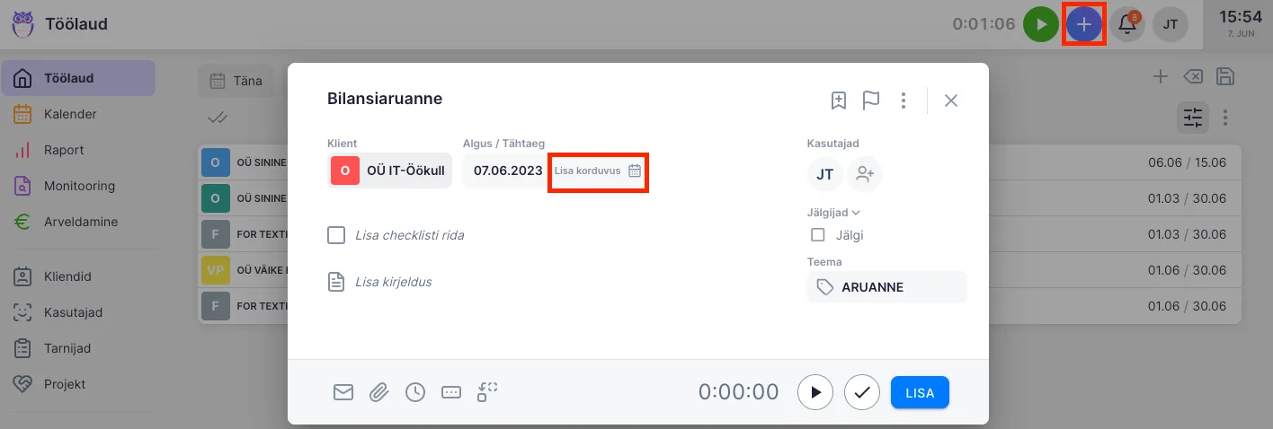 Section titled “Korduvuse lisamine uuele ülesandele”Lisa ”+” nupuga uus ülesanne. Vali “Lisa korduvus” kalendri ikooni juures.