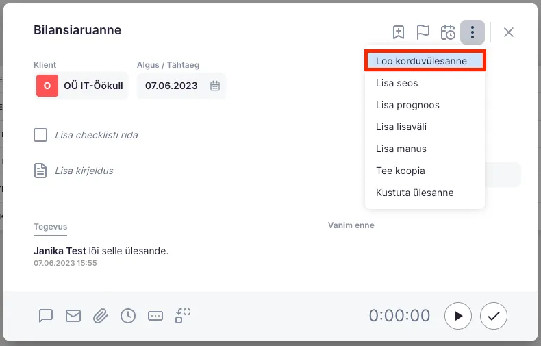 Kui soovid juba olemasolevat ülesannet korduvaks muuta vajuta ülesande päises olevale kolme punktiga ikoonile ning vali rippmenüüst “Loo korduvülesanne”.