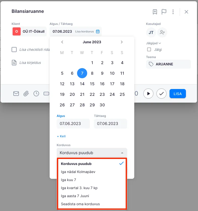Lisaks alguskuupäevale saab korduvatele ülesannetele määrata ka tähtaja. Loe tähtaja määramise kohta.