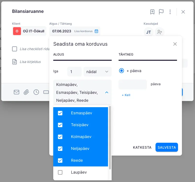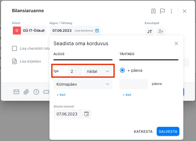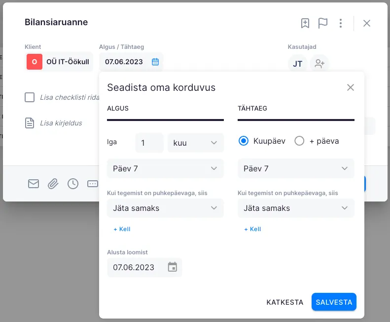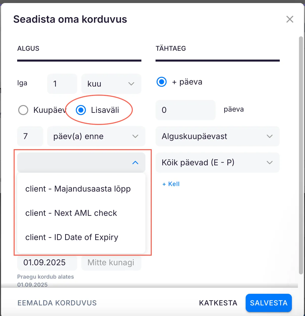 Section titled “Korduvülesande algus kuupäevalise kliendivälja põhjal”Kui sul on vaja, et korduvülesanded lähtuksid konkreetse kliendi kuupäevast (nt majandusaasta lõpp, palgaarvestuse kuupäev või rahapesu tõkestamise tähtaeg), saad siduda korduvülesande alguse kliendi lisaväljaga.