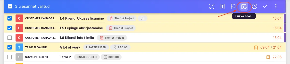 Kui näed, et tänasesse planeeritud ülesanne ei mahu plaani ning tähtaeg veel tagant ei sunni, siis kasuta “Lükka edasi” nuppu ning ülesanne liigub valitud päeva peale.