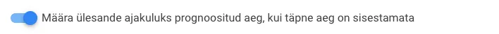 Section titled “Mida annab prognoosi sisestamine?”Ülesannetele saab märkida aega nii numbreid käsitsi sisestades kui ka stopperit kasutades. Milleks veel prognoos? Aga selle pärast, et oskaksid arvestada, kui palju üks või teine töö aega võiks võtta. Prognoosi näidatakse ka kalendris, et planeerimist veelgi lihtsamaks teha.