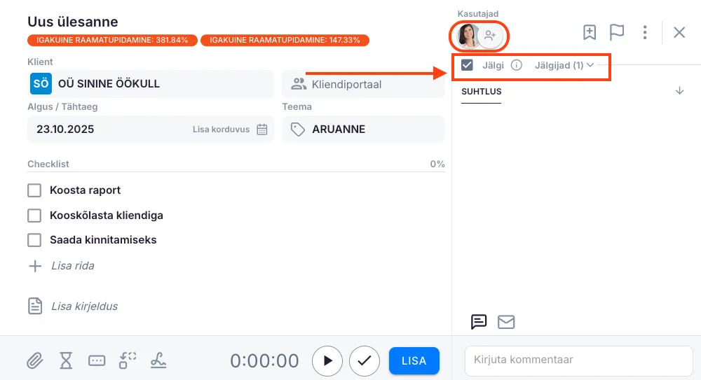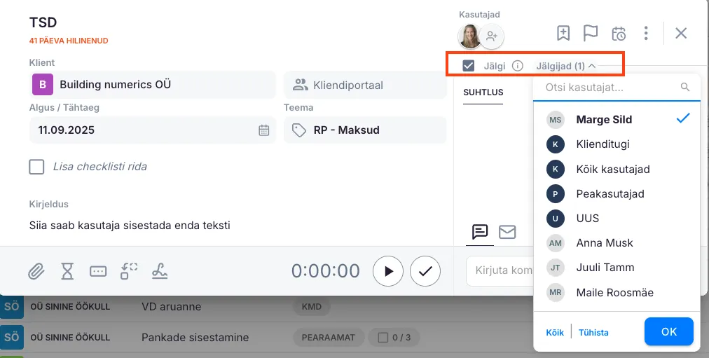 Näide: Koolitad uut raamatupidajat kuu lõpu sulgemise protsessis. Määra ülesanne talle (ta on ülesande liige) ja märgi end jälgijaks. Nii näed tema uuendusi ja saad anda juhiseid ilma, et ülesanne sinu töökoormusesse lisanduks.