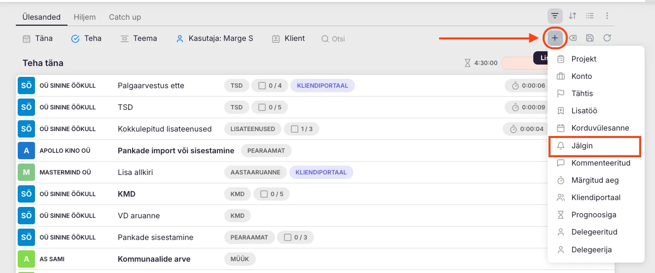 Section titled “3. Jälgi ülesandeid kliendi tööplaanis”Kui soovid jälgida korduvaid ülesandeid konkreetse kliendi puhul: