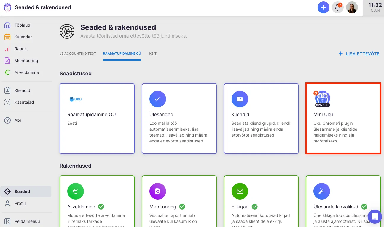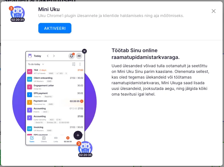 Section titled “Veebipõhine aja mõõtmise rakendus”Mini-Uku on veebipõhine liides, mille abil saad oma töölaua kaasa võtta ka teistesse akendesse kus parasjagu töötad. Olgu selleks raamatupidamisprogrammid või Maksu- ja Tolliameti kodulehekülg - tegemist vajavad ülesanded on Mini-Ukus alati silme ees.