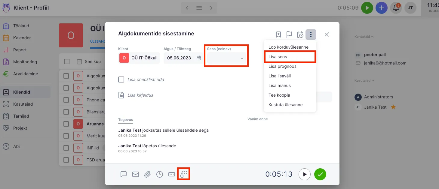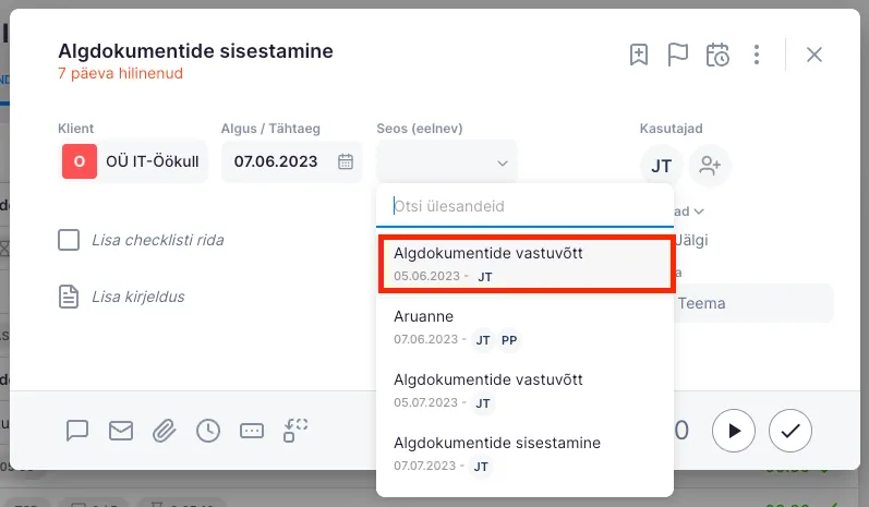 Kliki kahe kastiga ikoonil ülesande jaluses, et määrata seos. Seda vajutades avaneb väli “Seos”. Rippmenüüs on kirjas kõik selle kliendi ülesanded, mis jäävad +/- 45 päeva piiridesse (seose saad lisada ka läbi 3 punkti menüü, ülesande ülevalt paremalt servast).