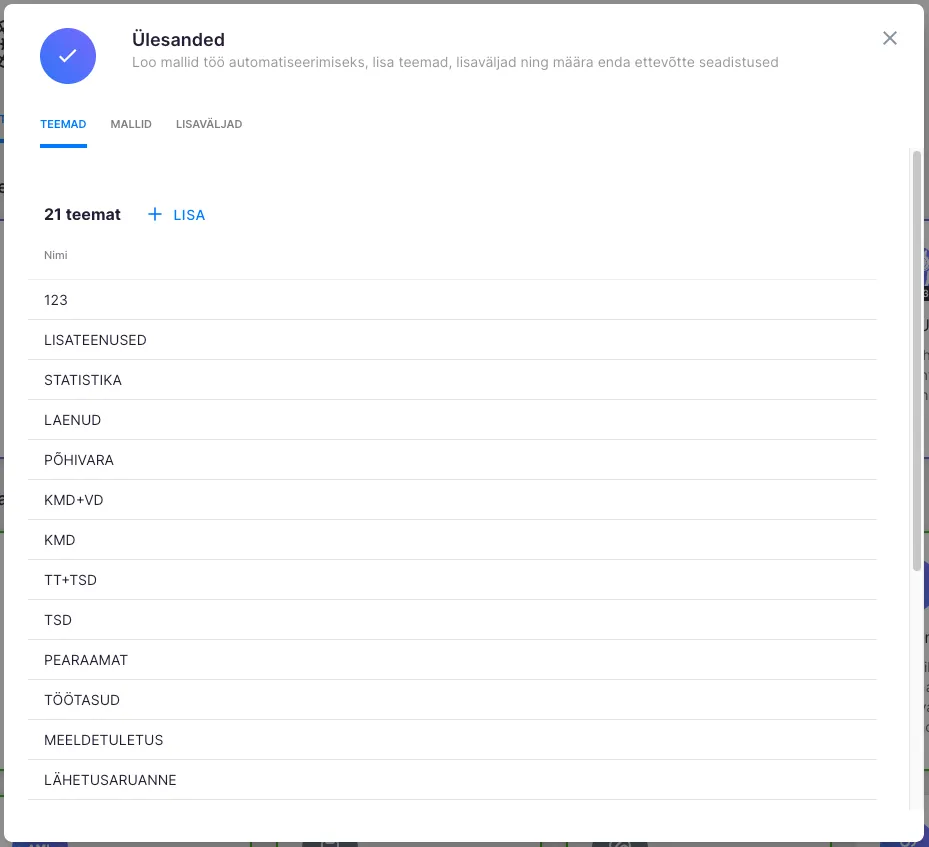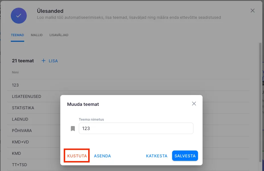 Teemade kustutamine aitab teemade loetelu hoida aktuaalsena ning välistab võimaluse, et töötaja kasutaks ülesannete juures vale teemat.