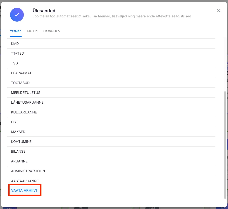 Kui teema on arhiveeritud on seda võimalik vaadata “Ülesanded” menüü “Teemad” sektsiooni all, vajutades “Vaata arhiivi” nupule.