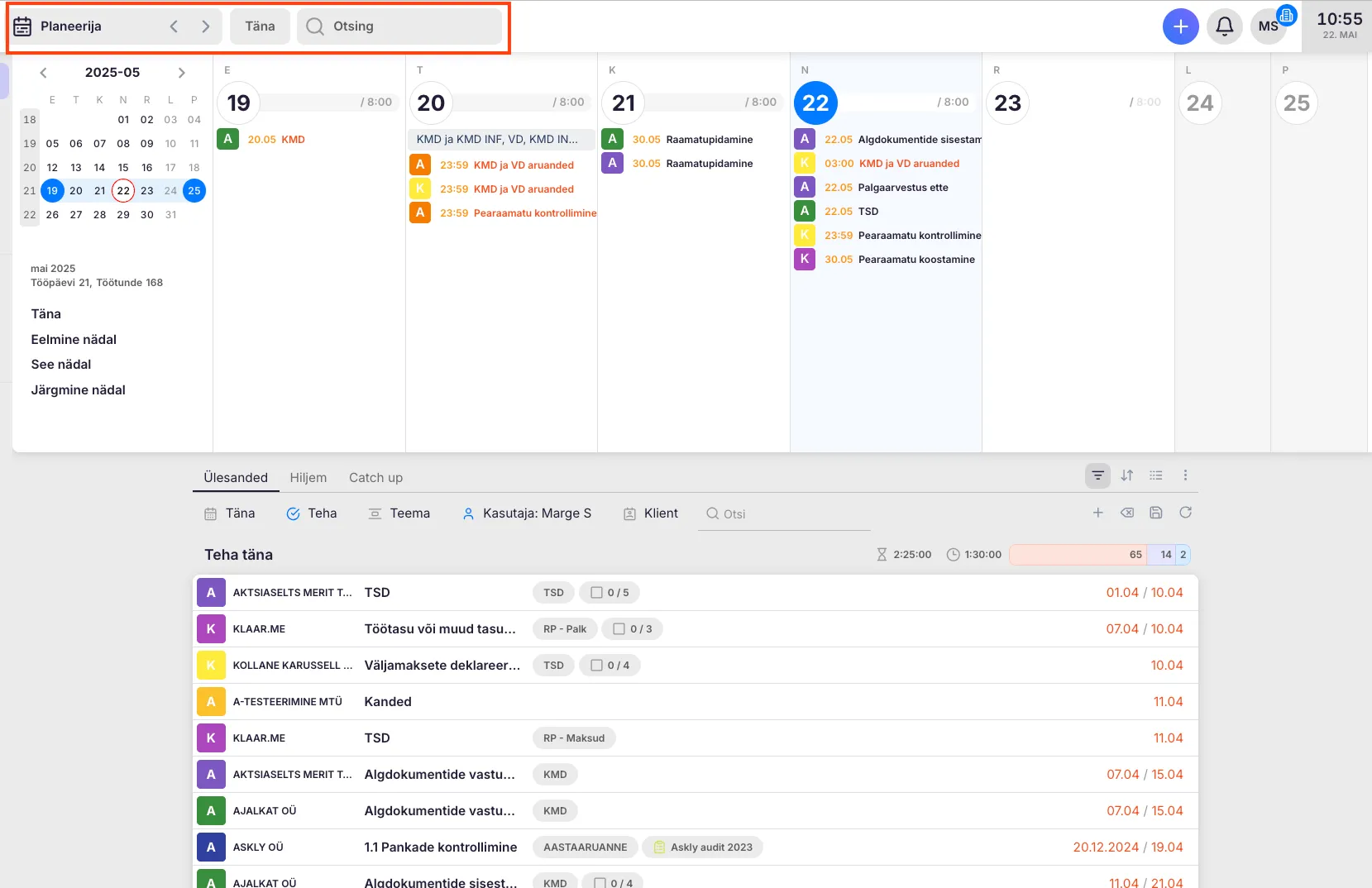 - Planeerija – nädala vaade koos ülesannete ümberajastamise (lohistamise teel) võimalusega