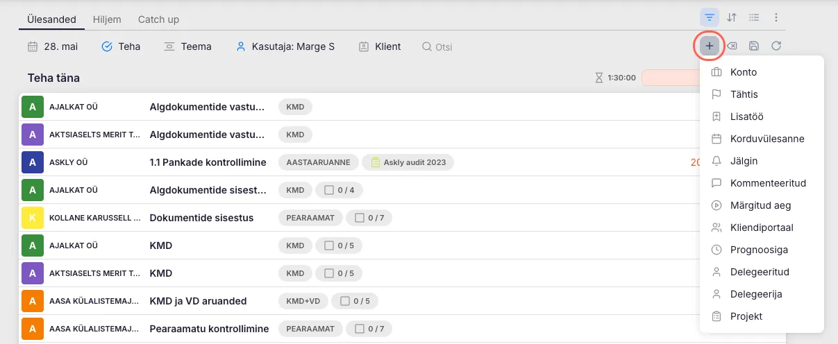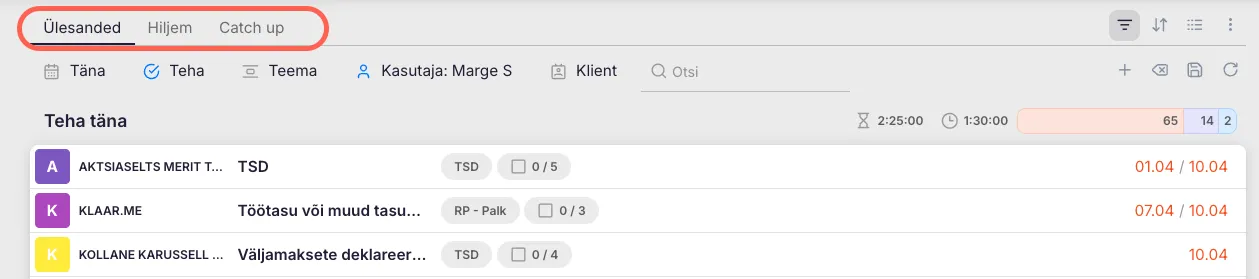- Ülesanded – vaikimisi avaneb vaade tänase päeva ülesannetega