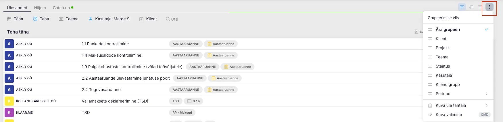 Grupeeri klientide järgi – töölaual kuvatakse vaid klientide nimed. Kliendile vajutades avaneb nimekiri tema ülesannetest.