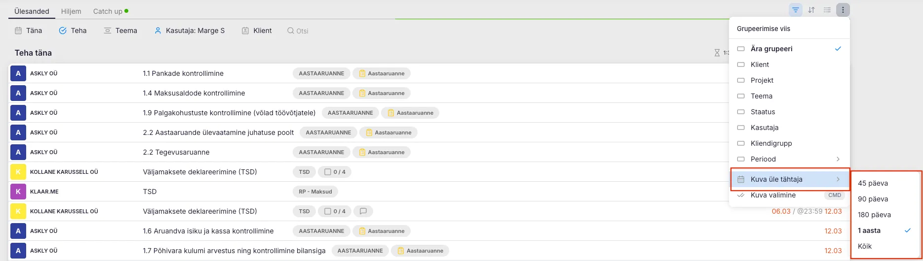 Kui kuupäeva filtreid pole valitud, kuvab Uku vaikimisi tänase päeva ülesanded. Kui soovid näha varasemaid, vali 45, 90 või 180 päeva või 1 aasta tagasi loodud ülesanded. Samuti on valik “Kõik”, mis on kuni 2 aastat tagasi loodud ülesanded.