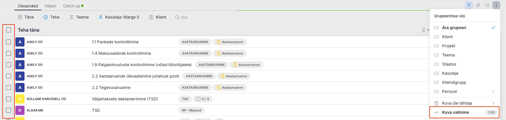 Kuva valimine – lubab kuvada valikukastid klientide nimede ette. Valiku abil saad valida kliendid, kelle ülesannetega soovid teha hulgitoiminguid: massiliselt kustutada, arhiveerida, delegeerida, edasi lükata või tehtuks märkida.