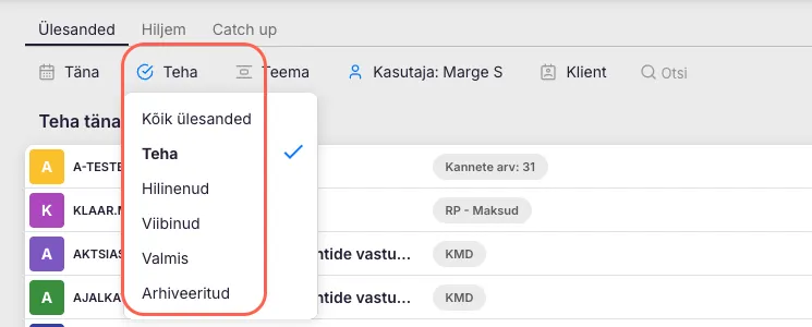 Ülesannete staatus: Kõik, Teha, Hilinenud, Viibinud, Valmis, Arhiveeritud