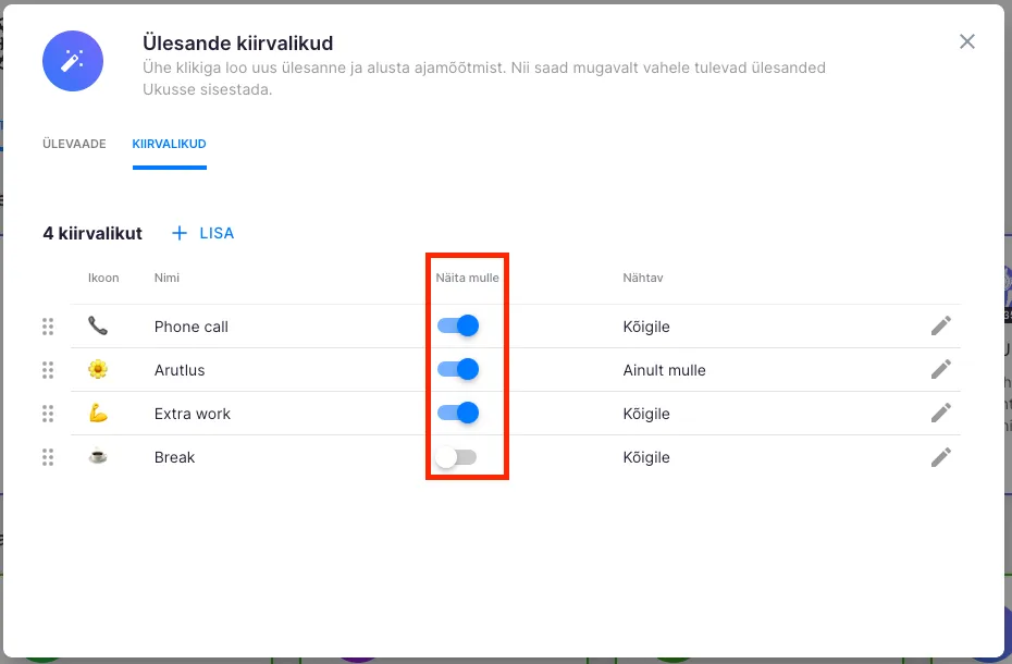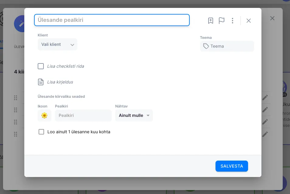 Kliki nupul ”+ Lisa”. Seejärel saad ülesande seadistada. NB Luues kiirvalikuid kõigile kasutamiseks tea, et kuna kiirvalikule peab lisama kliendi, siis selle kasutamiseks peab kasutajal olema ligipääs sellele kliendile.
