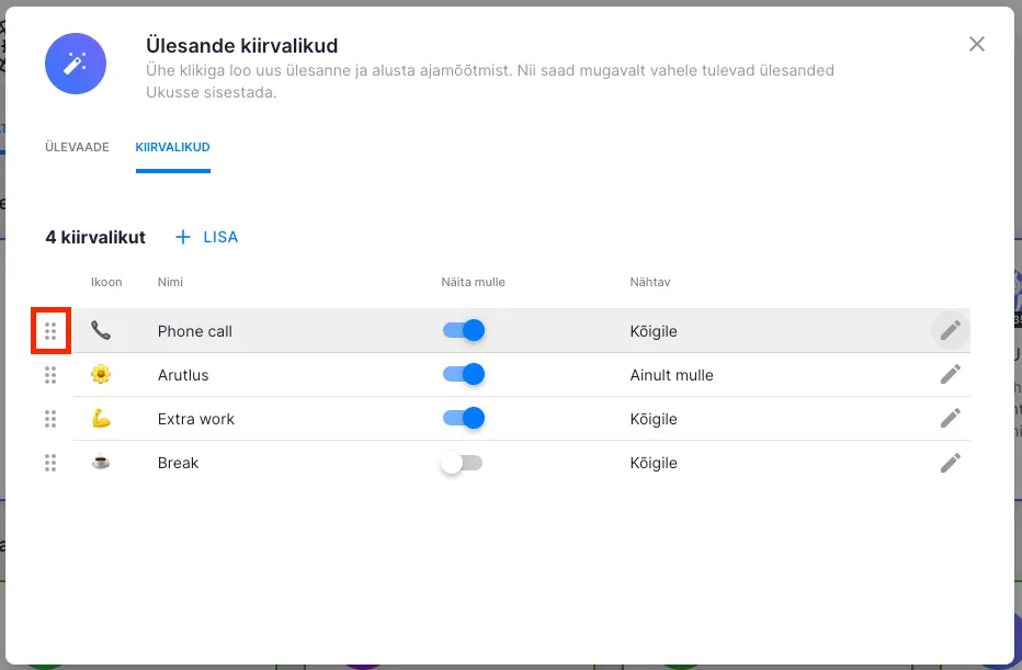 - Kiirvalikutesse tekib sinu eelmine pooleliolev ülesanne, millega saad mugavalt jätkata.