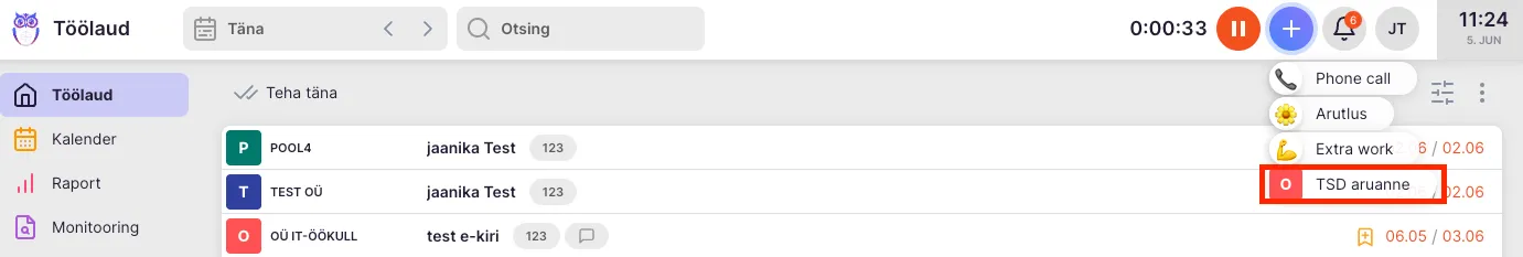 Section titled “Raamatupidajal tuleb ikka ootamatuid ülesandeid ette”Loo ühe klikiga uus ülesanne ja alusta aja mõõtmist. Ülesande kiirvalikud võimaldavad mugavalt vahele tulevad ülesanded (nt telefonikõne ja e-post) Ukusse sisestada. Nii oled kindel, et kõik tööd saavad sisestatud.