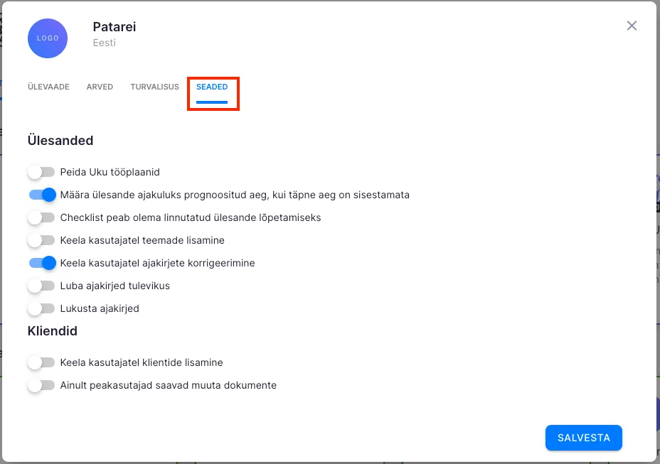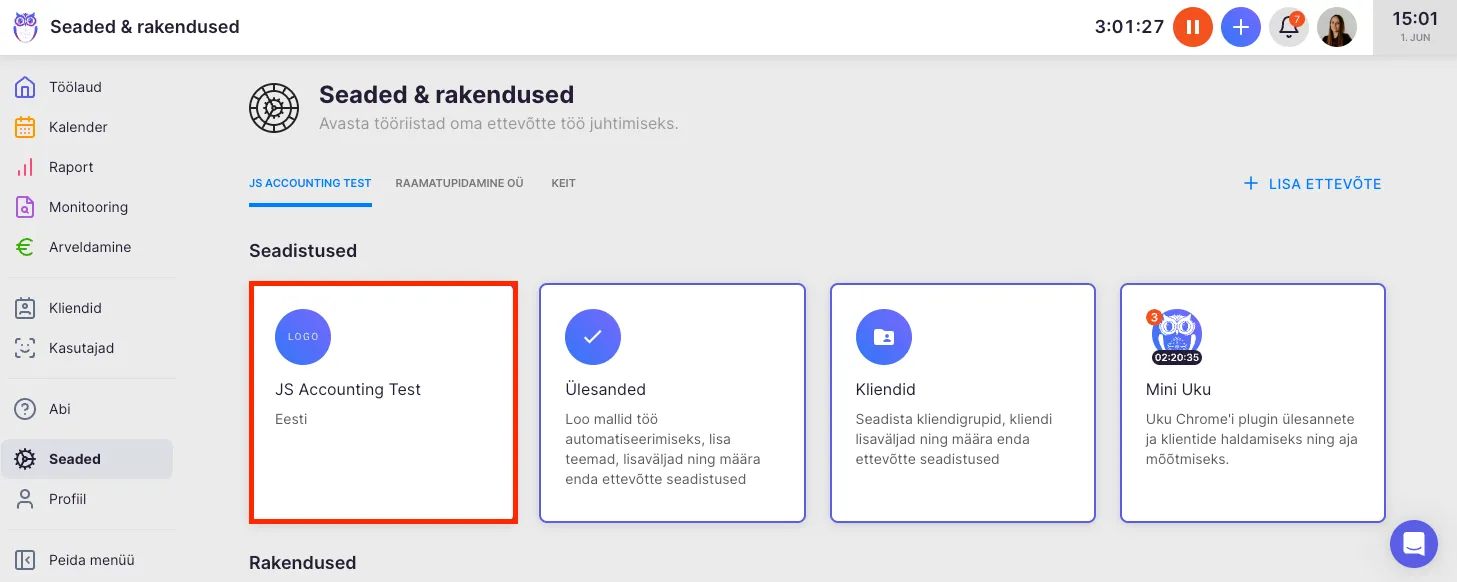 Section titled “Uku on kohandatav täpselt sinu raamatupidamisbüroo vajadustele”Selleks, et saaksid tööd mugavalt teha, on võimalik ülesandeid seadistada vastavalt vajadustele. Ülesannete seadistused leiad valides peamenüüst “Seaded” ning valides ettevõtte äpi.
