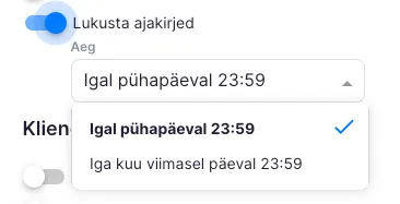 See funktsioon võimaldab ettevõttepõhiselt lukustada ajakirjed kasutajatele. Valikus on kas nädalapõhine- pühapäeviti kell 23.59 või kuupõhine- kuu viimasel päeval kell 23.59. Antud funktsioon lubab siiski administraatoritel teha hilisemaid parandusi ajakirjetes.