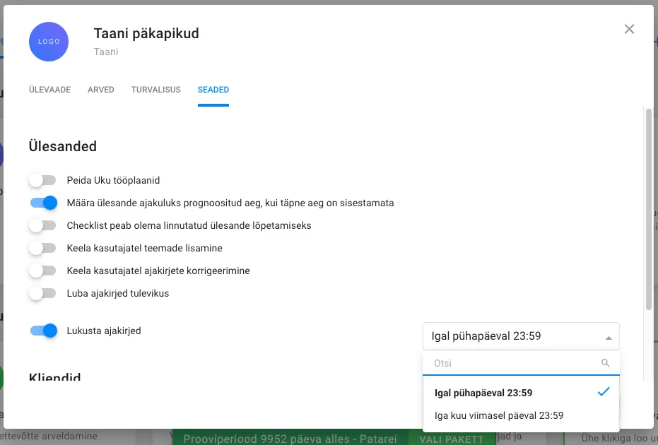- Määra, kas ajakirjed lukustatakse iganädalaselt või -kuiselt. NB! Ajakirjete lukustamine rakendub tavakasutajatele. Admin õigusega kasutajad saavad ajakirjeid muuta ka lukustatud perioodil.