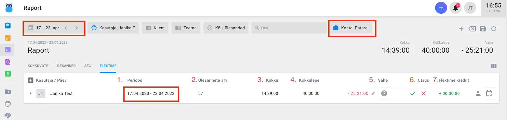 Section titled “Flextime raport näitab, kas oled oma töötunnid vastaval perioodil täitnud”Ülevaadet oodatud töötundide täituvusest näeb kasutaja Flextime raportis. Flextime’i raport avaneb alati aktiivse perioodi kuupäevadega ning aktiivse konto filtriga.