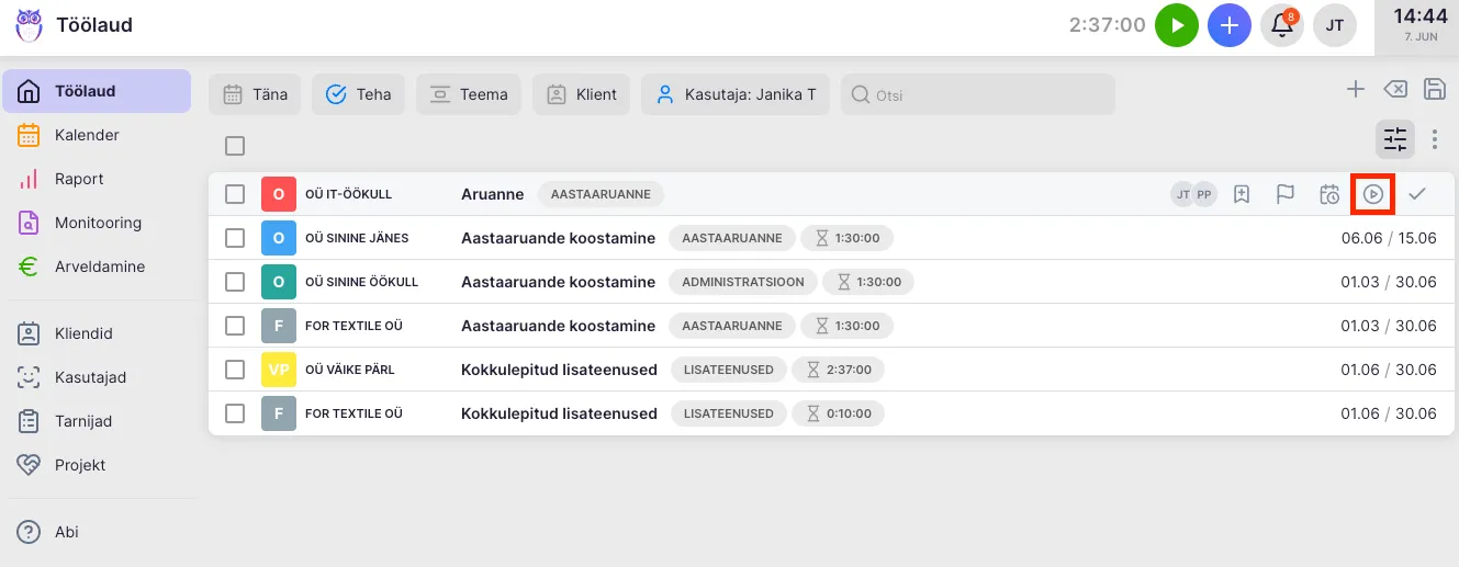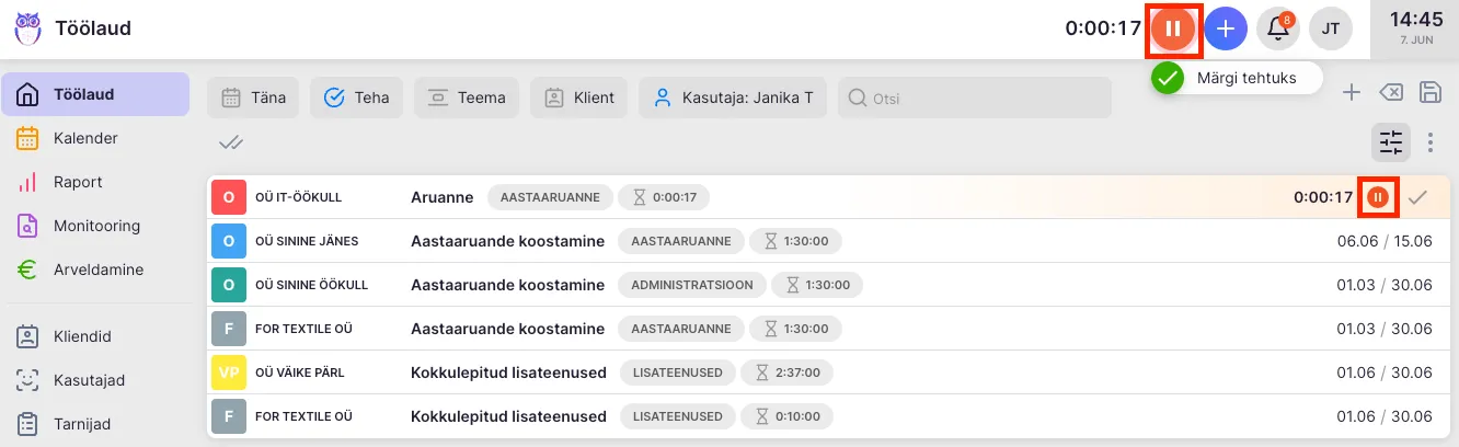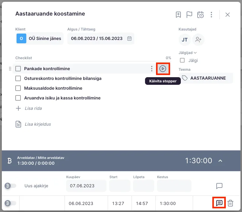 Kui soovid tööga jätkata, vajuta stopper uuesti tööle. Ühele ülesandele saab aega lisada mitu korda. Stopperiga sisestatud ajakirjeid on võimalik hiljem korrigeerida.