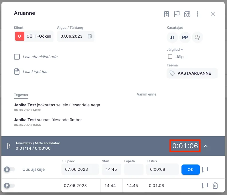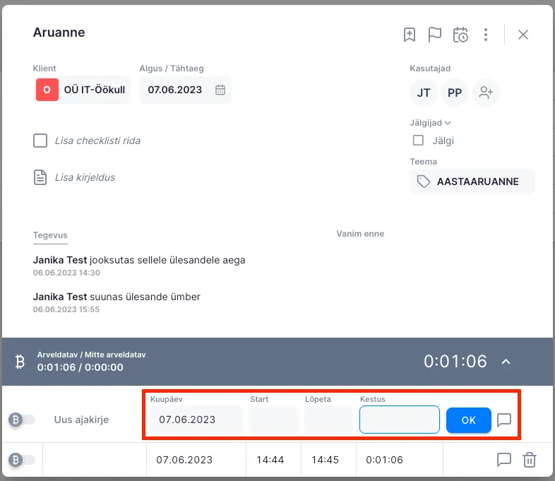 Section titled “Mõõda tööaega, et teada saada millele, kellele ja miks sinu aeg kulub”Saad mõõta, prognoosida, sisestada ja kuvada töödeks kulunud aega. Aega saab mõõta stopperiga ning hiljem teha korrektuure. Ajakirjeid saab märkida arveldatavaks või mittearveldatavaks. Kasuta nimetatud ajaarvestuse võimalusi ning oma ülevaadet tehtud tööde ajakulust!
