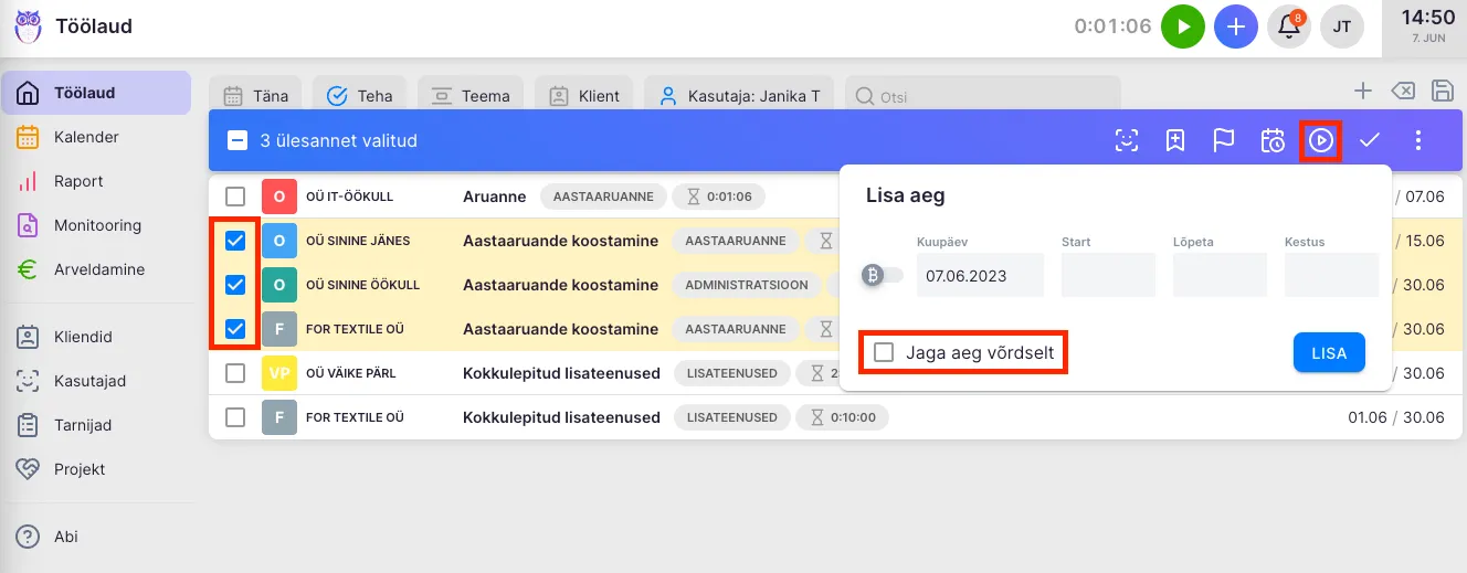 Saad lisada kõikidele ülesannetele samasuguse aja või jagada sisestatud aeg kõikide linnutatud ülesannete vahel võrdselt.