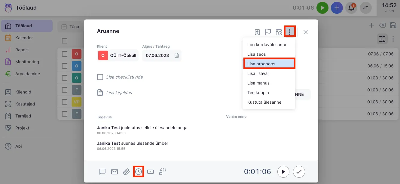 Prognoosi lisamiseks ava ülesanne, kliki kolme täpi ikoonil ja vali “Lisa prognoos”.