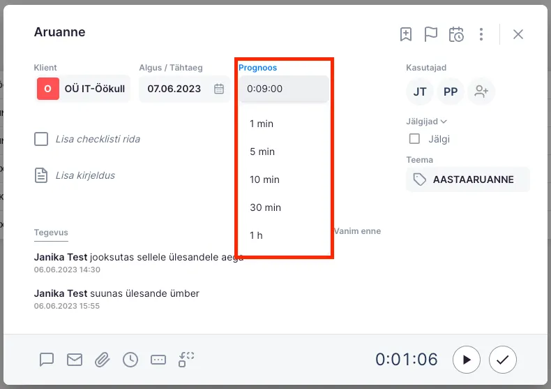 Section titled “Prognoos”Kui tead ette, kui palju ülesanne aega võtab, tasub ülesandele sisestada prognoositud aeg juba eelnevalt mallis. Juhul kui ülesanne märgitakse tehtuks aega lisamata, muudetakse soovi korral eelnevalt lisatud prognoositud aeg ülesandele kulunud ajaks. Selleks, et prognoos = ajakulu, on vajalik sisse lülitada vastav seadistus “Seaded” vaates, oma ettevõtte äpis, seadete vahekaardil.