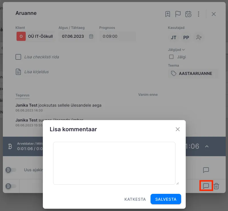 Section titled “Ajakirjete kommenteerimine”Kui ühel ülesandel on mitmeid ajakirjeid, siis on süstematiseerimiseks hea lisada neile kommentaarid millega sel hetkel tegeleti. Selleks ava ülesanne, kliki aega märkival numbril ning seejärel vastava ajakirje kõrval oleval jutumulli ikoonil. Avaneb kommentaari lisamise aken. Lisatud kommentaari saad näha, kui hoiad kursorit jutumulli ikooni kohal.