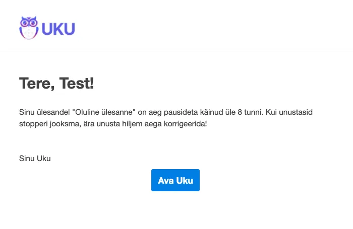 Section titled “Millal ja kuidas teavitused tulevad?”Kui stopper on järjest töötanud üle 8 tunni, saadetakse sulle teavitav e-kiri.