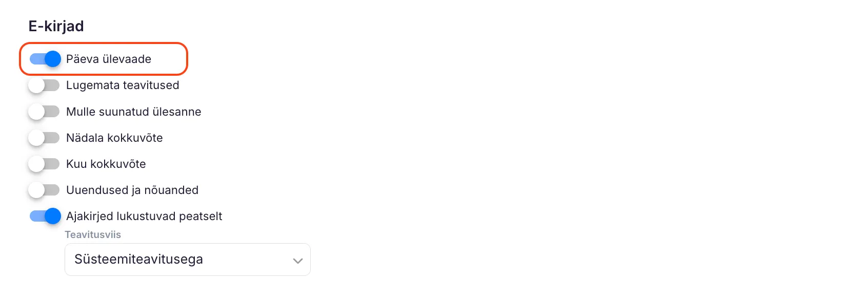 NB! E-posti teavituste saamiseks peab profiili all olev “Päeva ülevade” nupp olema aktiveeritud. (Aktiveerimiseks mine Seaded - Profiil ning aktiveeri nupp)