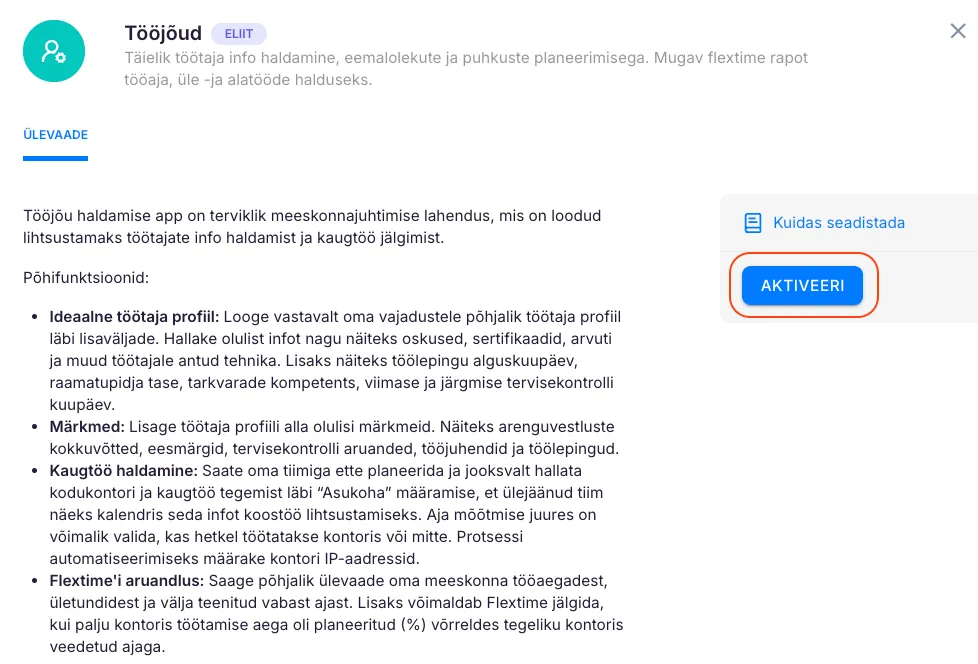 Section titled “Kuidas aktiveerida?”- Vali “Seaded & Äpid” -> leia äppide vahel “Tööjõud” ja klõpsa sellele.