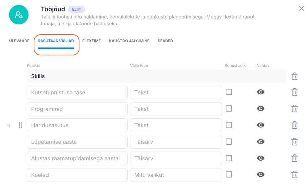 Selle nupu aktiveerimisel saavad kasutajad täita ja vaadata lisavälju oma profiilil. Need väljad on nähtavad nii kasutajale kui ka administraatorile. Lisaväljad võimaldavad ettevõttel koguda täiendavat informatsiooni kasutajate kohta, nagu näiteks oskused, sertifikaadid, haridus või muu oluline teave. See aitab kaasa paremale personalihaldusele ja võimaldab administraatoritel teha informeeritud otsuseid meeskonna juhtimisel.