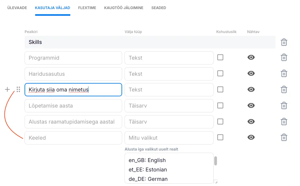 Section titled “Täiendatud töötaja profiil”Vali vahekaart “Kasutaja väljad”