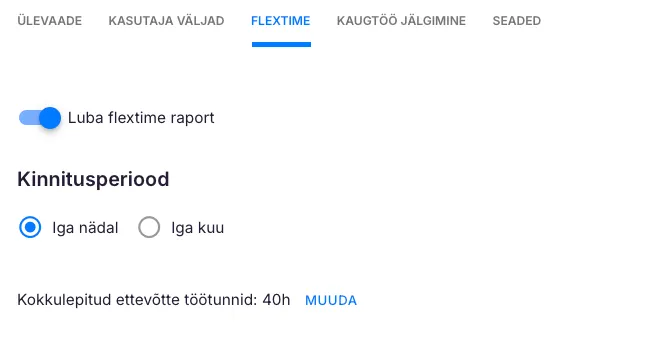 Section titled “Flextime”Vahekaardil Flextime saad määrata, kas soovid raporti aktiveerida, valida tööaja kinnituse perioodi sageduse ning näha, millised on kokkulepitud ettevõttesiseseid töötunnid.