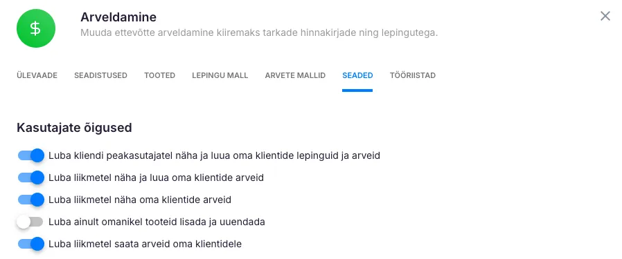 Section titled “Liikmete õigused ja rollid”Siin saad määrata, millised meeskonnaliikmed saavad vaadata ja hallata arveid, lepinguid ja tooteid. Need õigused aitavad säilitada kontrolli ja samas anda vajalikele liikmetele juurdepääsu.