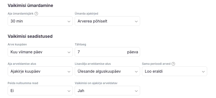 Section titled “Aja ümardamise seaded”Määra ettevõtteülesed ümardamise reeglid ajajälgimise põhjal koostatud arvetele.